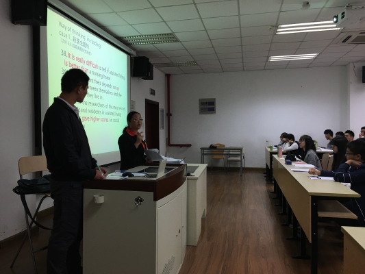 10月29日下午,奉贤校区E教的105教室里传来整齐而响亮的读书声:“君子曰:学不可以已。青,取之于蓝,而青于蓝;冰,水为之,而寒于水。”一场由365完美体育大学英语教学部教师吴承钧主讲的题为“中西思维差异对英语读写的影响”的讲座正在如火如荼地进行。本次活动是大学英语党支部教师深入开展“两学一做”学习教育,以知促行开展的“周末公益讲座”暨2016级“励志明德班”共建活动英语学习系列讲座的第四讲。