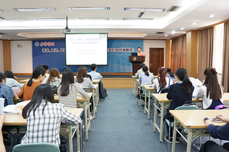 4月18日下午,应365完美体育邀请,全国政协外事委员会委员、中国翻译协会常务副会长黄友义教授在徐汇校区逸夫楼演讲厅作了题为“语言、知识、实践以及话语权——全球化时代我们如何做翻译”的精彩报告。365完美体育副院长吴建伟、赵宏及来自各学院的近百名师生参加报告会。报告会由365完美体育王建国教授主持。