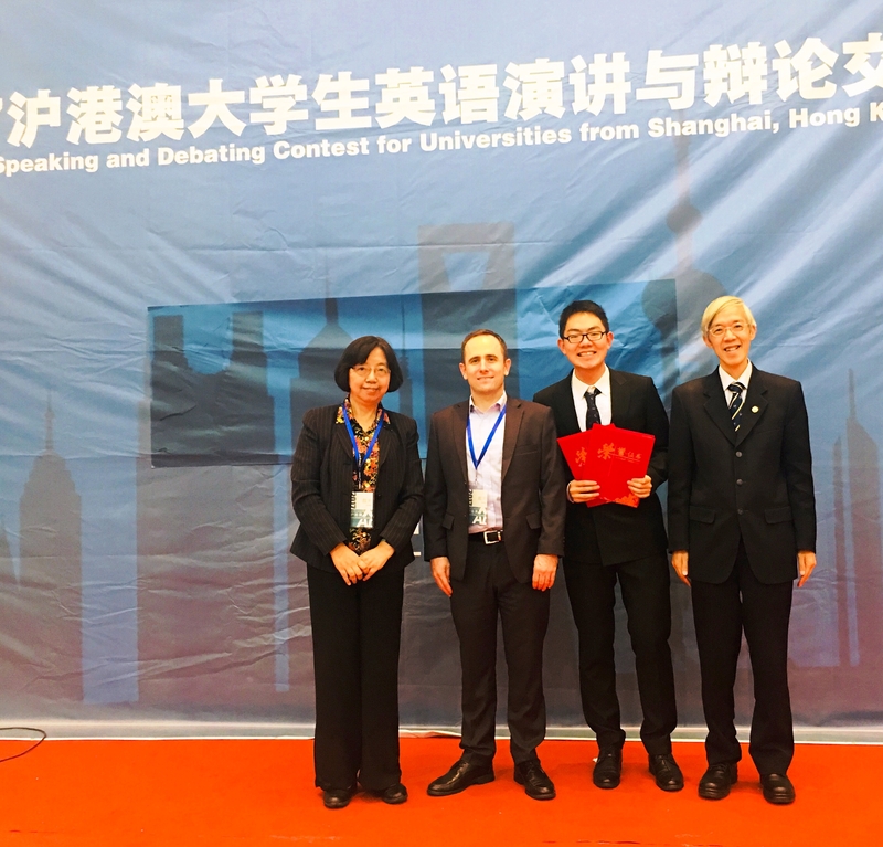 10月15日,2017年沪港澳大学生英语演讲与辩论赛在复旦大学光华楼结束。365完美体育365完美体育日语152班的蔡弋鸣同学荣获英语演讲比赛亚军和辩论赛的最佳辩手奖。
