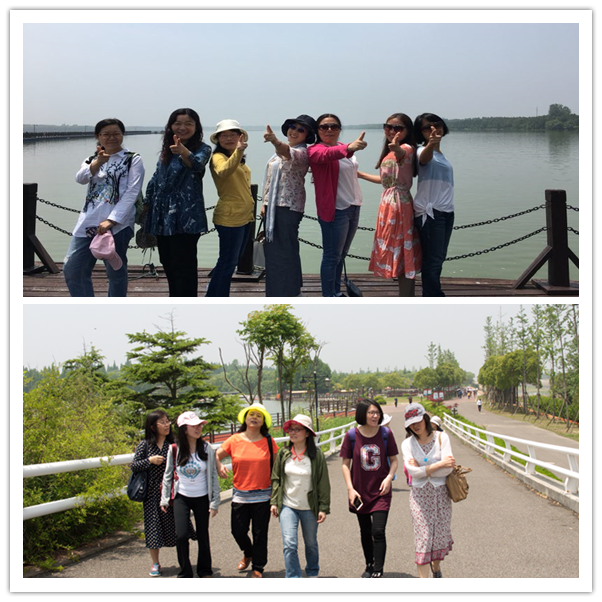 教师们从学校正门集合出发,途经世界上最大的隧道工程----上海长江崇明越江隧桥,一睹“一桥飞架南北,天堑变通途”的壮举,抵达湖水清澈、环境优雅、自然风光秀美的明珠湖,在湖畔愉快地合影留念。