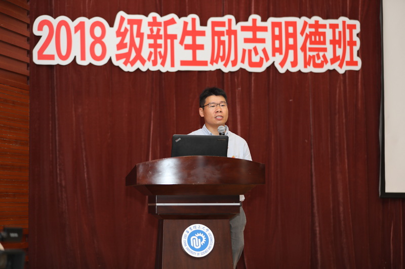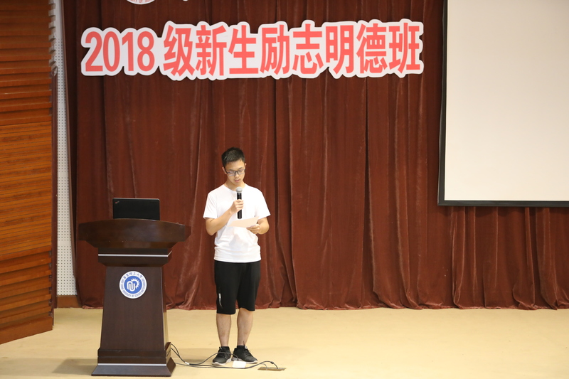 外语184班的朱德祥同学代表2018级“励志明德班”的全体新生发言。他说,对于像自己这样初中才开始学英语的同学而言,英语学习仍有诸多困难,英语水平存在较大的提升空间。他十分感谢外语学院老师的关心和即将给予的指导,表示要珍惜机会,发掘潜力,取得更大的进步。