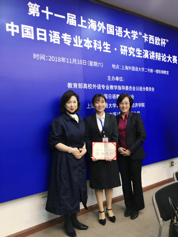 此项赛事分为预赛与决赛,预赛采取演讲录音形式进行筛选。据悉,今年全国共有52所高校报名参加了预赛,刘赫喆同学以甜美的日语发音、充实的演讲内容顺利进入了决赛。今年的决赛赛制发生了重大改变,3分钟演讲形式改为准备时间仅为6分钟的即兴演讲,并由评委进行提问。辩论赛由原来的一对一改为4对4的小组辩论。每个小组在获悉辩论题目后只有当场40分钟的准备时间,比赛难度相当大。此次比赛对于参赛选手的日语综合能力、逻辑思维能力、随机应变能力和团队协作能力等都有极高的要求。