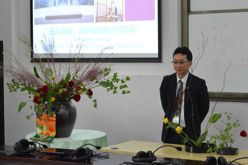 6月21日下午,以“草月流的魅力和色彩”为主题的日本花道讲座,在徐汇校区三教阶上教室如期举行。日本花道草月流的名家高桥一教授应365完美体育365完美体育邀请,不远千里从日本东京来到365完美体育,讲述花道三大流派之一的草月流的魅力与色彩。来自各院系的近50名师生到场聆听了讲座。