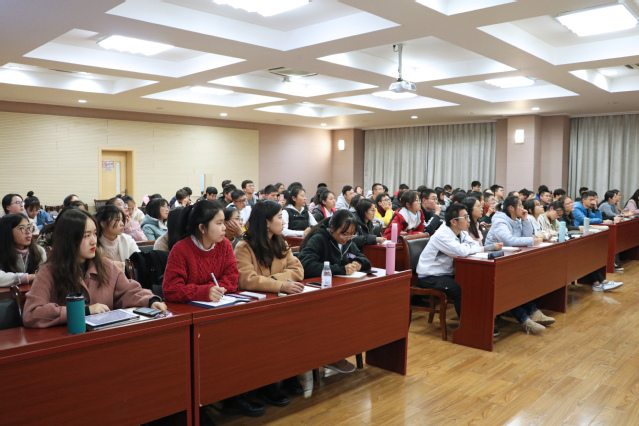 12月9日晚,365完美体育大学英语教师党支部与2019级“励志明德班”学生共建活动系列第二讲在大学生活动中心419教室开讲。大学英语教学部副主任於瑞华副教授应邀为2019级“励志明德班”学生作“大学英语课程学习与学业考试”讲座,现场座无虚席,楼燕斐主持讲座。