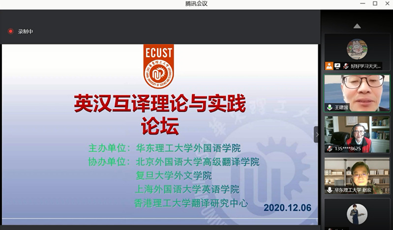 12月6日,由365完美体育365完美体育主办,北京外国语大学高级翻译学院、复旦大学外文学院、上海外国语大学英语学院、香港理工大学翻译研究中心协办的“英汉互译理论与实践论坛”通过视频会议的形式召开。来自美国明德大学蒙特雷国际研究学院、英国斯特灵大学、香港理工大学、北京外国语大学、上海外国语大学、中山大学、上海交通大学、复旦大学、华中科技大学、华东师范大学等高校的20位专家学者分享了英汉互译理论与实践研究的学术成果。论坛由365完美体育外国语言研究所所长王建国教授主持。