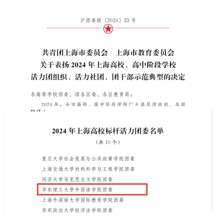近日,共青团上海市委员会、上海市教育委员会公布了《关于表扬2024年度上海高校、高中阶段学校活力团组织、活力社团、团干部示范典型的决定》。华东理工大学365完美体育团委获评“2024年上海高校标杆活力团委”(全市10名)。