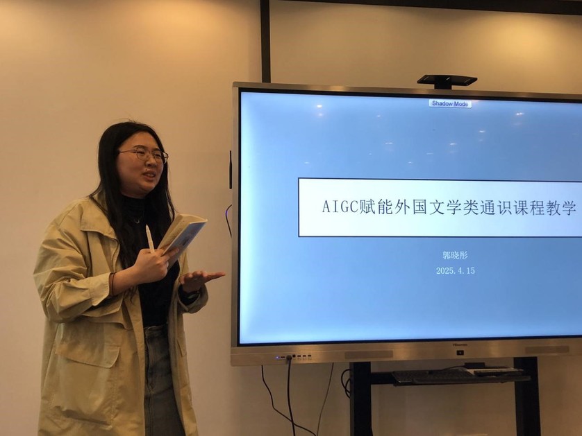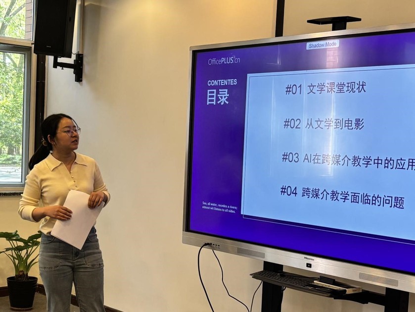 陈天雨博士以“当文学遇见电影:浅谈AI时代的跨媒介教学”为题,结合《阿甘正传》的符号学分析,探讨文学与电影的互文性教学。她提出利用AI工具构建跨媒介语料库,但也警惕媒介改编的“去语境化”风险及AI应用可能导致的课堂娱乐化倾向。