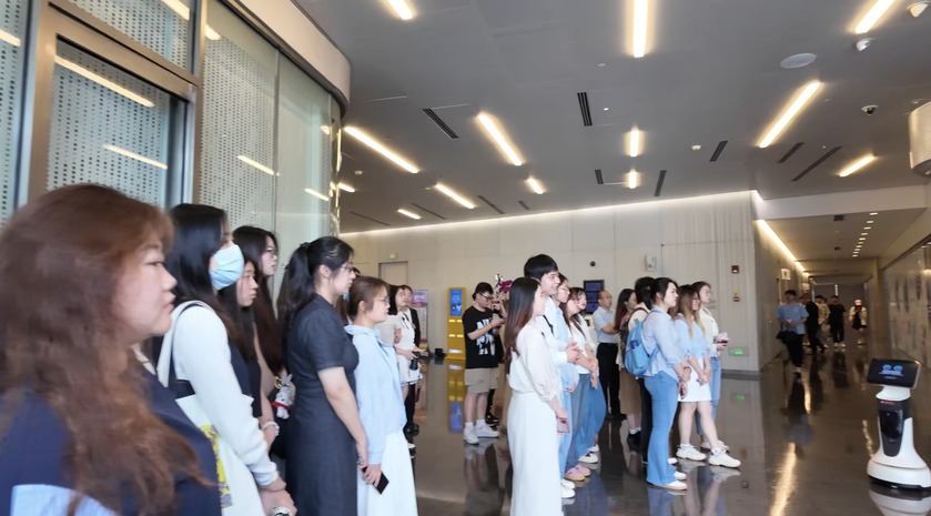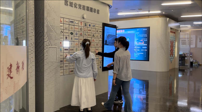 师生们跟随智能机器人“陆小二”,循迹探访陆家嘴金融城党建服务中心。从政治生活厅到信息发布厅,从区域联建厅到党群工作站,几大功能区串联起“建组织、送服务、强功能、善治理”的党建创新脉络。通过实地观摩、视频回溯与专题研讨,师生深入学习习近平总书记关于基层党建的重要指示,领悟党建引领下金融城治理的智慧方案。科技赋能的智慧党建平台、国际化人才培育机制,更让青年学子深刻感受红色基因与全球视野的深度融合,激励他们以语言为桥、以专业为基,服务国家战略,传递中国治理智慧。